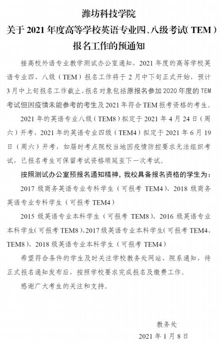 潍坊科技学院2021英语专四、专八、预报名通知